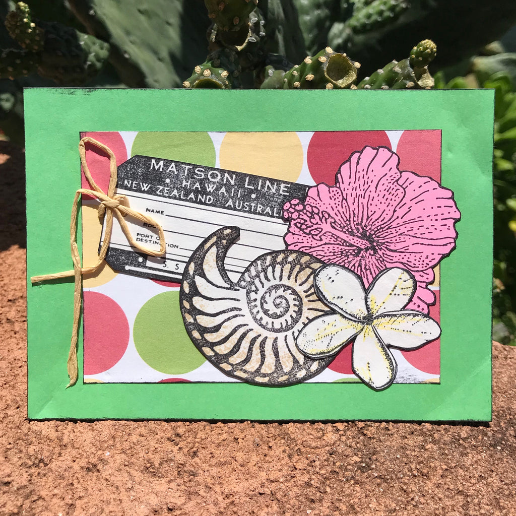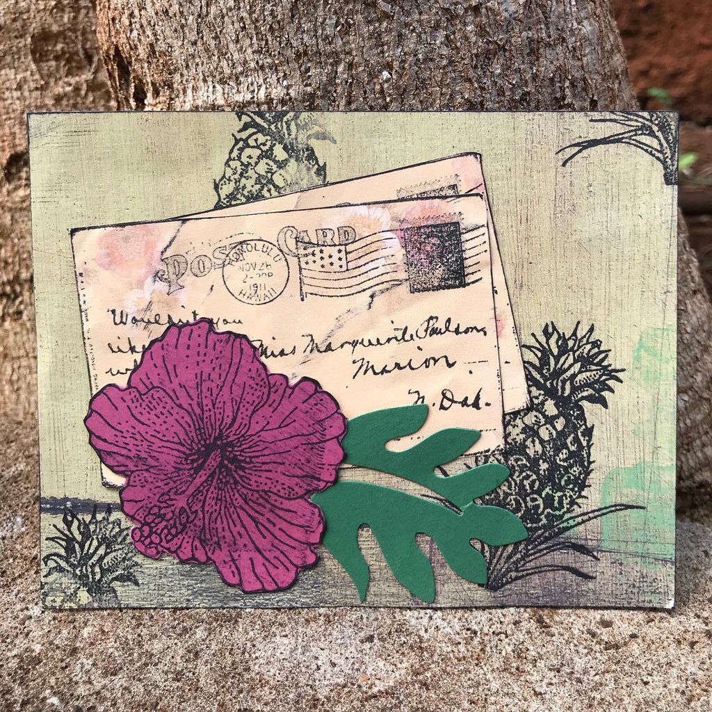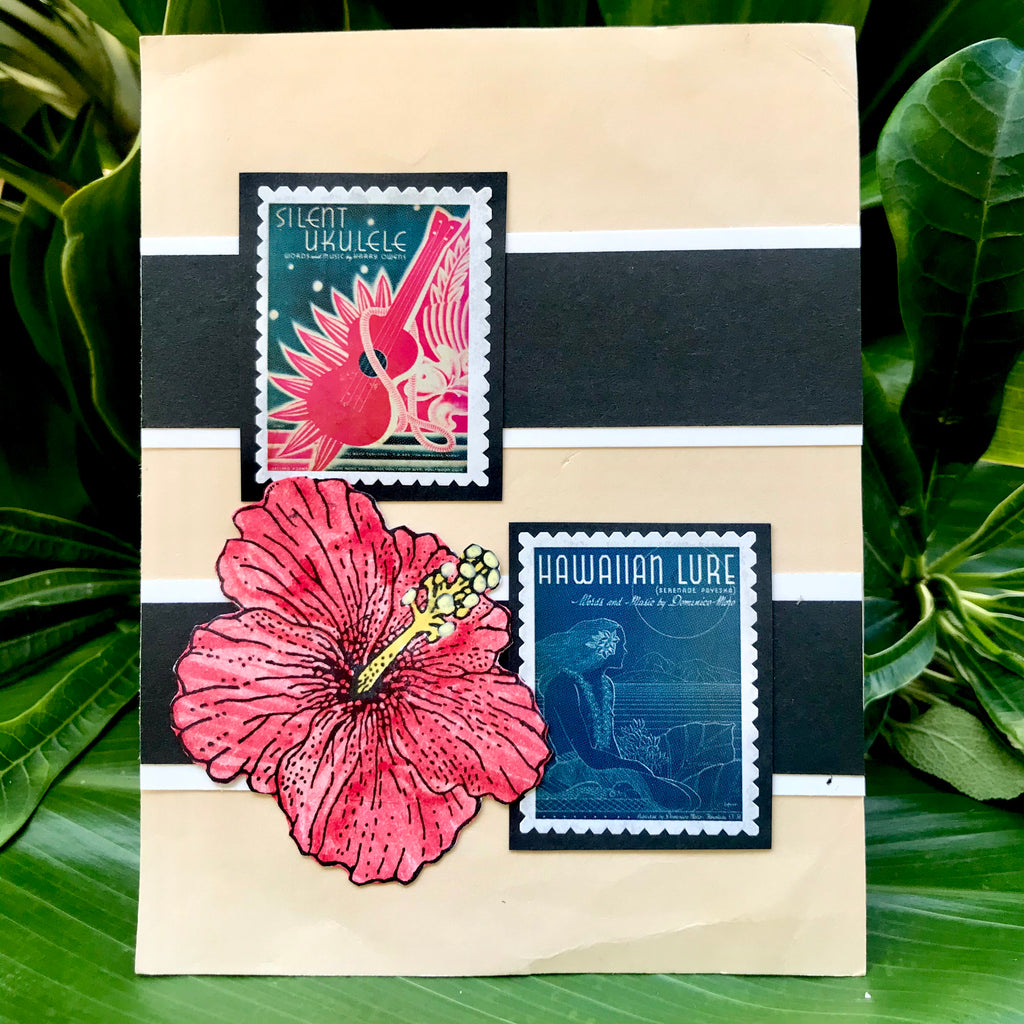 Sample cards pictured also use the X-Large Pineapple Plant, Single Hula Girl, Beach Girl , Large Single Palm, Cancellation 1939, Large Matson Tag, Medium Shell Honu, X-Large Laua'e, Small Laua'e, New Mahalo, Plumeria, Large Nautilus and Large Matson Tag stamps.
