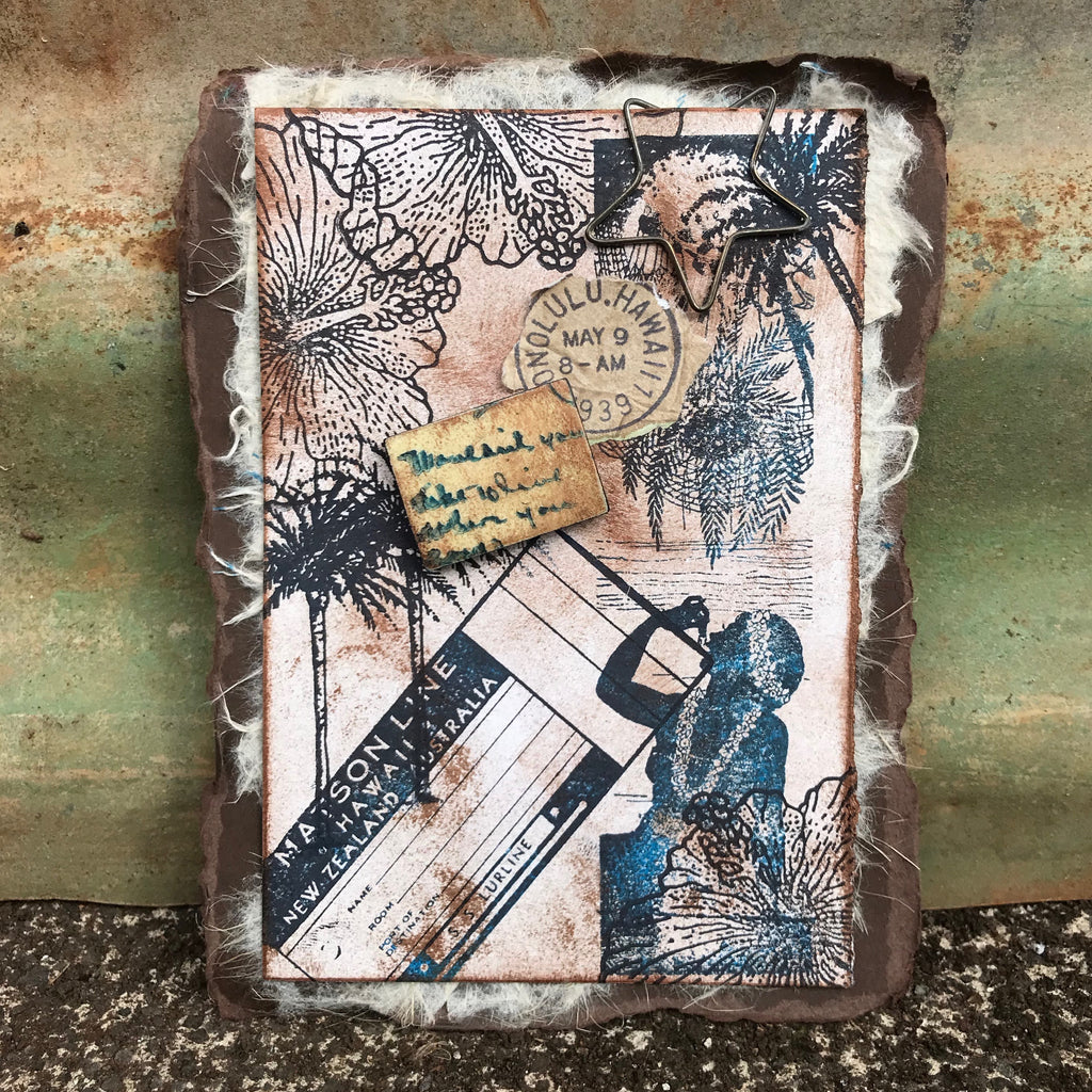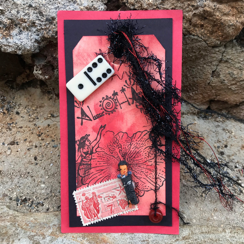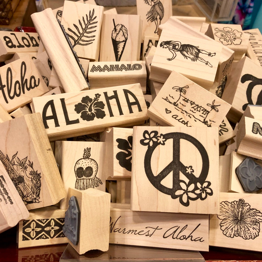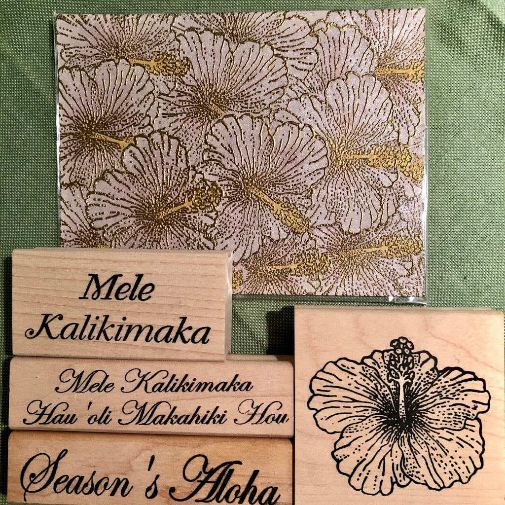 Sample cards pictured also use the X-Large Pineapple Plant, Single Hula Girl, Beach Girl , Large Single Palm, Cancellation 1939, Large Matson Tag, Medium Shell Honu, X-Large Laua'e, Small Laua'e, New Mahalo, Plumeria, Large Nautilus and Large Matson Tag stamps.
