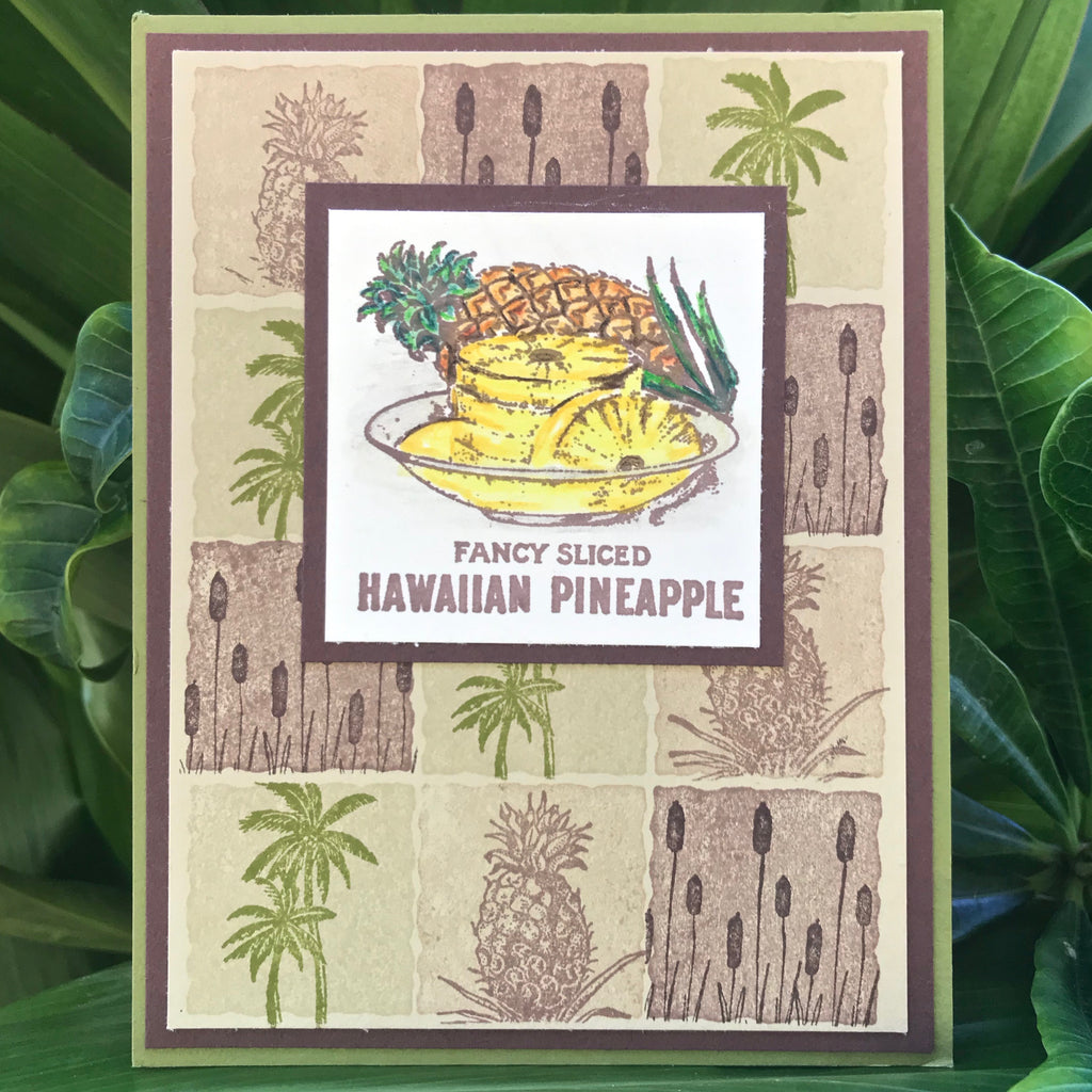 Sample cards pictured also use the Island Boy, Cindy's Palm, Fruit Stand, Pineapple Plant, Small Double Palm and Fancy Sliced Pineapple stamps.