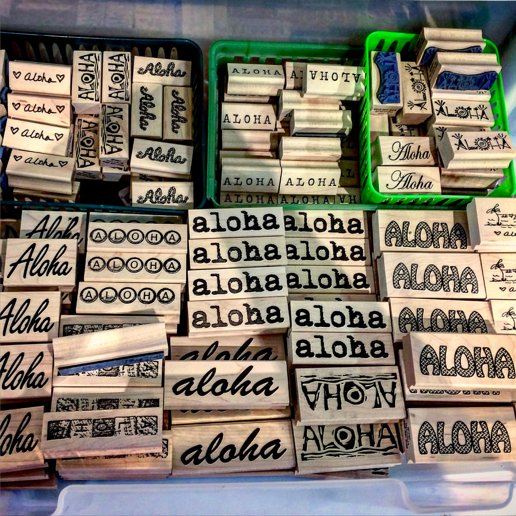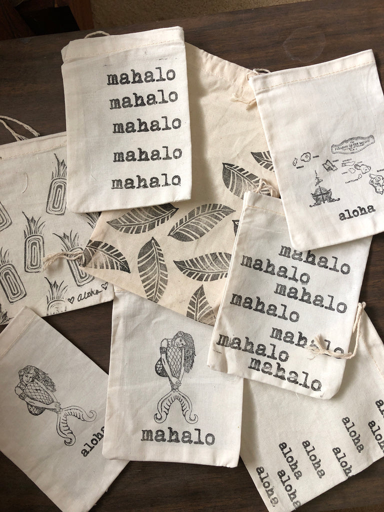 Sitting MermaidType Alohamap and Type Mahalo are also used to stamp these reusable versatile muslin eco gift bags.