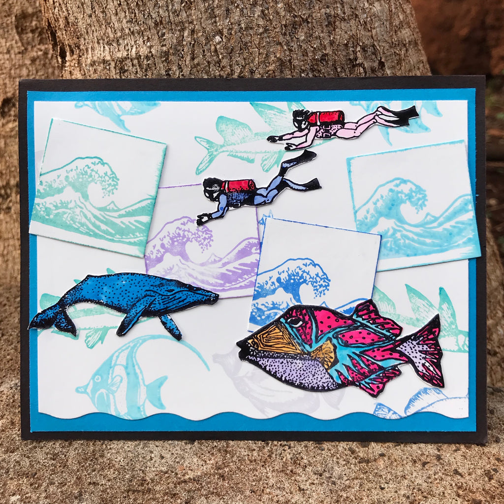 Sample cards pictured also use the Scuba Woman, Scuba Man and Malolo stamps.