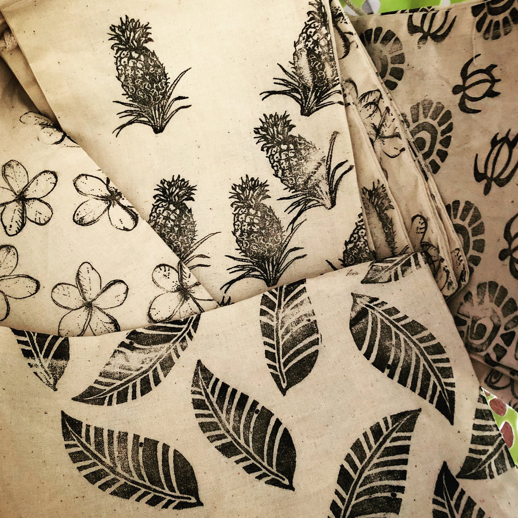 Plumeria, Large Carved Leaf, and the Pineapple plant are also used to stamp these reusable versatile muslin eco gift bags
